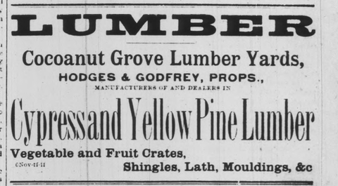 In 1891, Henry A. Hodges and B. Godfrey had started a small “sawmill on the line of the Jacksonville, Tampa & Key West Railway at Satsuma Heights.”25 Satsuma Heights is an unincorporated settlement about 6 miles south of Palatka in Putnam County, FL. In 1892, they moved to Buffalo Bluff, six miles south of Satsuma and erected a much larger mill to cut cypress and pine.26 By 1896, the firm had grown large enough that it could afford to establish a lumberyard in Cocoanut Grove.